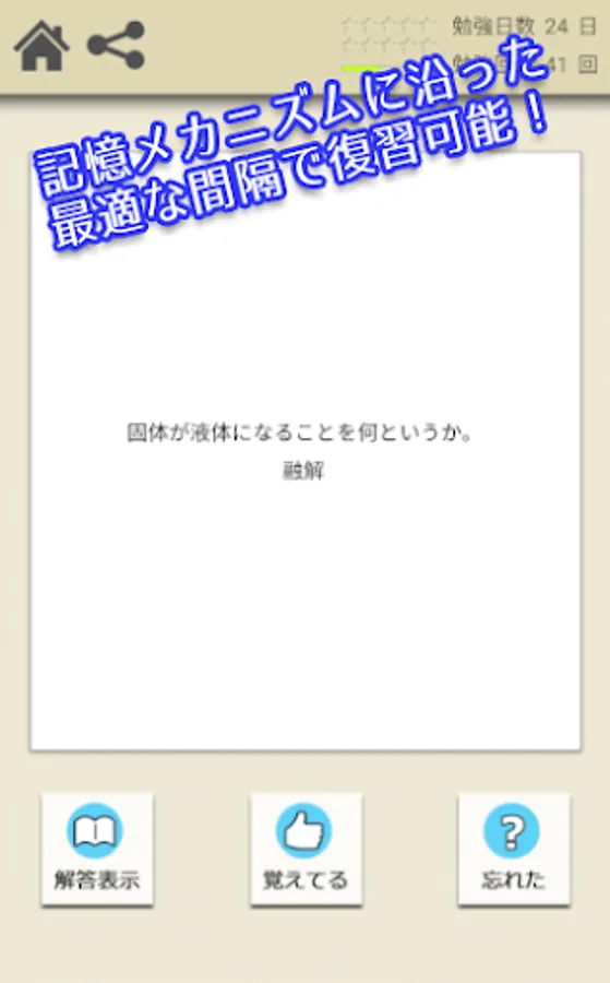 暗記カードのように学習を進めていきますが、出題される問題は確実に覚えることができるように、覚えていない問題は何度も出題されます。