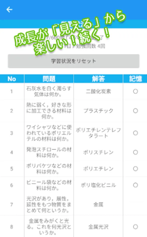 暗記には繰り返しの復習がとても重要ですが、このアプリは覚えていない問題を何度も繰り返し出題するようになっているため、勉強を進めていくだけでしっかりと覚えることができるようになっています。