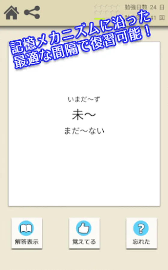 「解答表示」で解答を確認し、覚えていた場合は「覚えてる」、忘れていれば「忘れた」を押します。