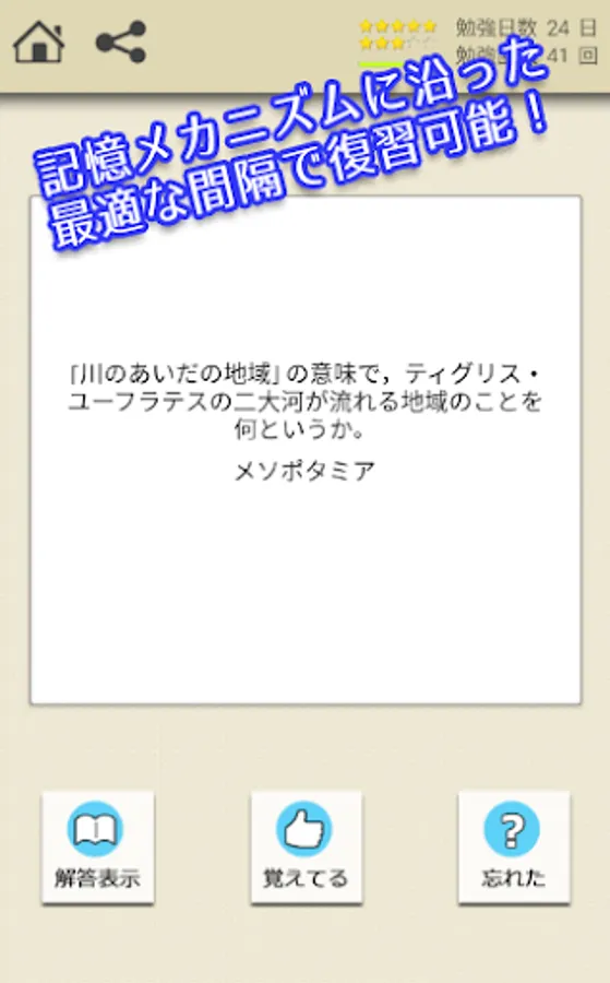暗記カードのように、出題される問題に対して答えを確認して学習を進めていきますが、覚えていない問題はしつこいくらいに出題されるため、しっかりと記憶に定着させることができます。