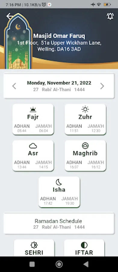 Masjid Omar Faruq app is created for Masjid Omar Faruq mosque's muslims and designed to meet daily Islamic needs. It contains features like prayer times, location, qibla direction via compass, Quran, hadith, dhikr counter and more.