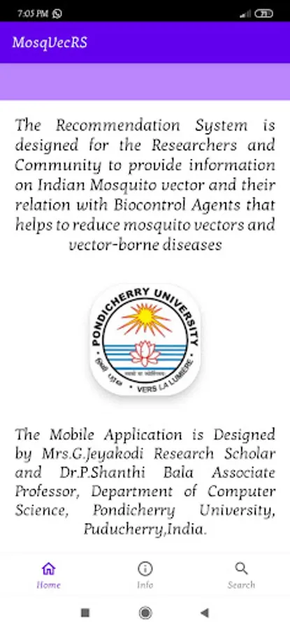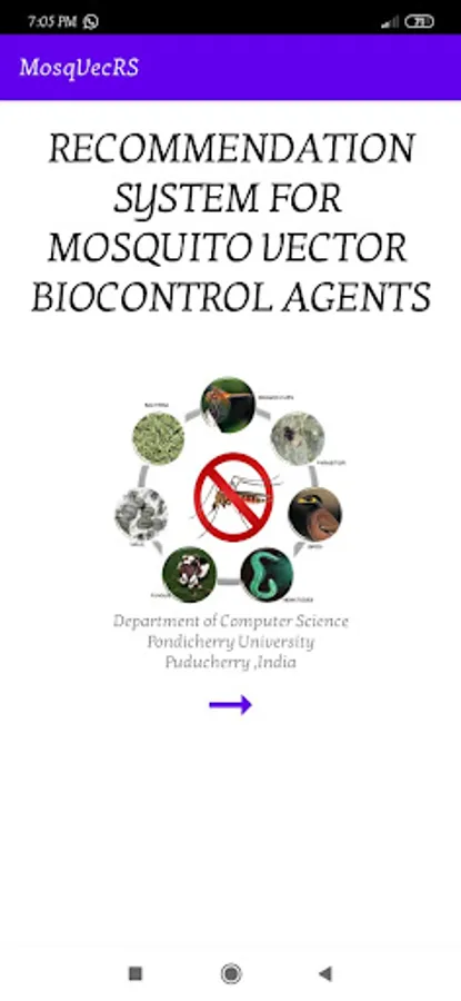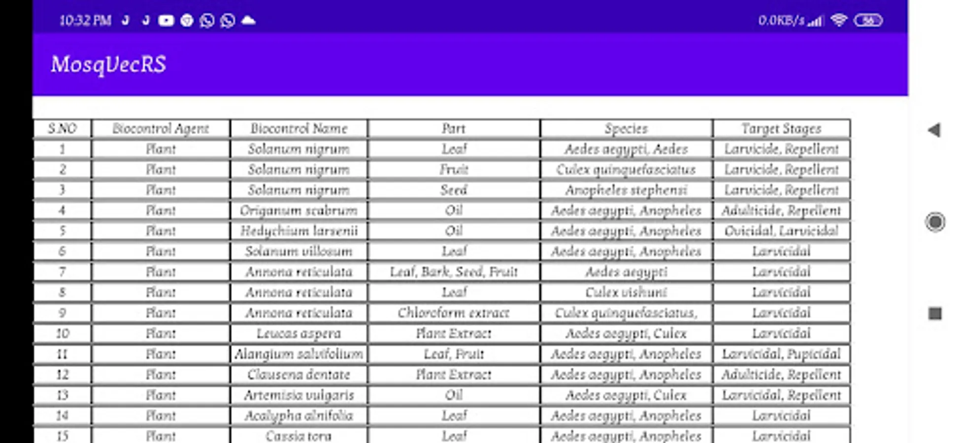 MosqVecRS - The Recommendation System on Mosquito Vector Biocontrol Agents is developed for exploring Mosquito Vector Information such as mosquito species names, images, pathogens, infectious diseases, and their various biocontrol agents. The goal of the application is to provide mosquito biological control awareness and its necessity to the community that may help to reduce mosquito-borne diseases. This system also helps to develop a harmless bioinsecticide for mosquito vector control.