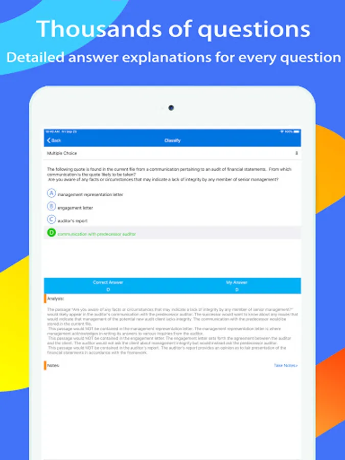 CPA AUD Exam Expert is a powerful exam simulator that allows you to choose various practice tests with detailed answer explanations for every question.