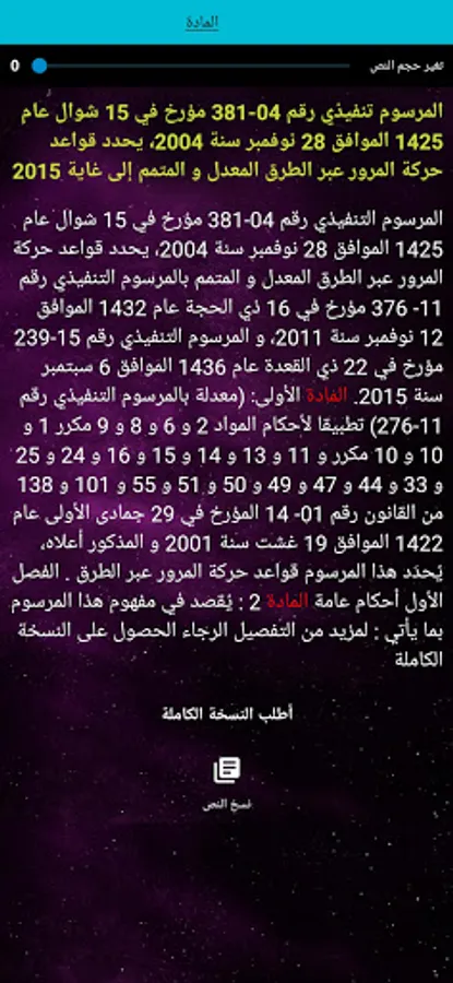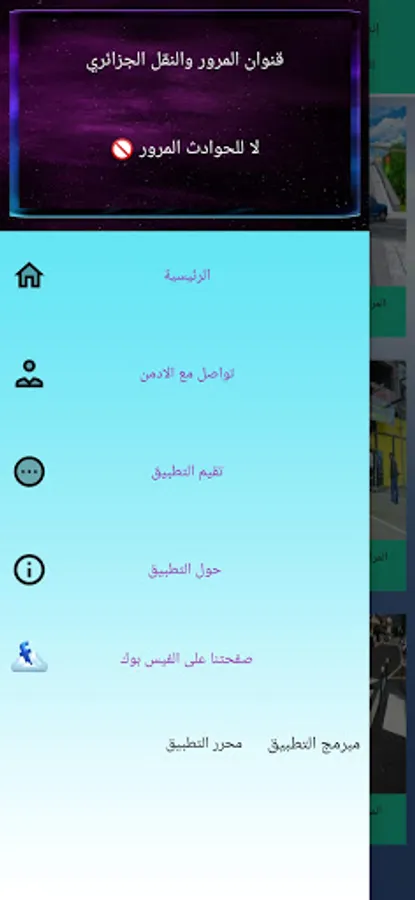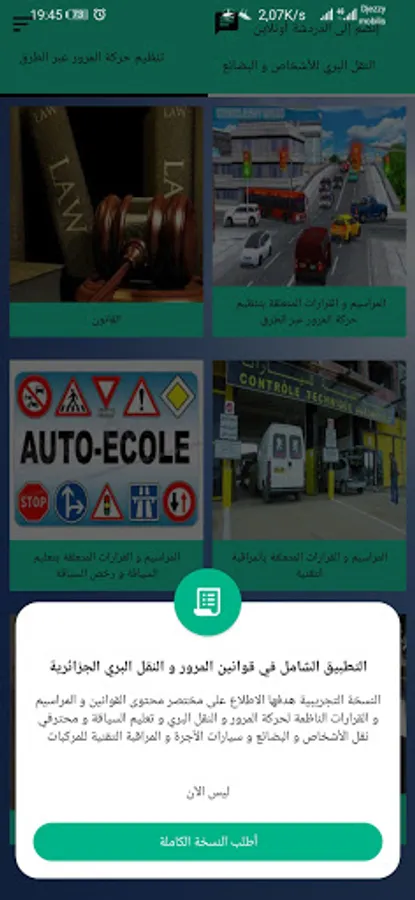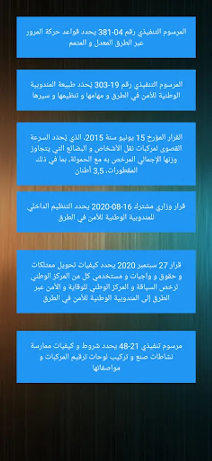 This application is concerned with spreading the traffic culture by displaying all the details of traffic laws through the roads and the land transport of people and goods from laws, implementing decrees and ministerial decisions with the aim of achieving safe driving without accidents and it is important for all categories of drivers, whether beginners or professionals or private and public carriers of goods As well as for driving schools, for technical control centers for vehicles, for lawmen from road security companies to the National Gendarmerie and the police, for judges and lawyers, as it is a unique application of its kind that contains everything related to the regulation of traffic and land transport of people and goods.