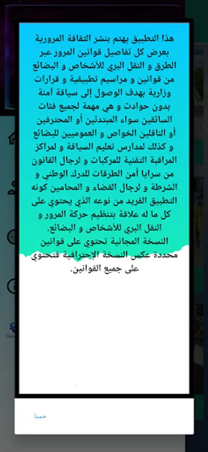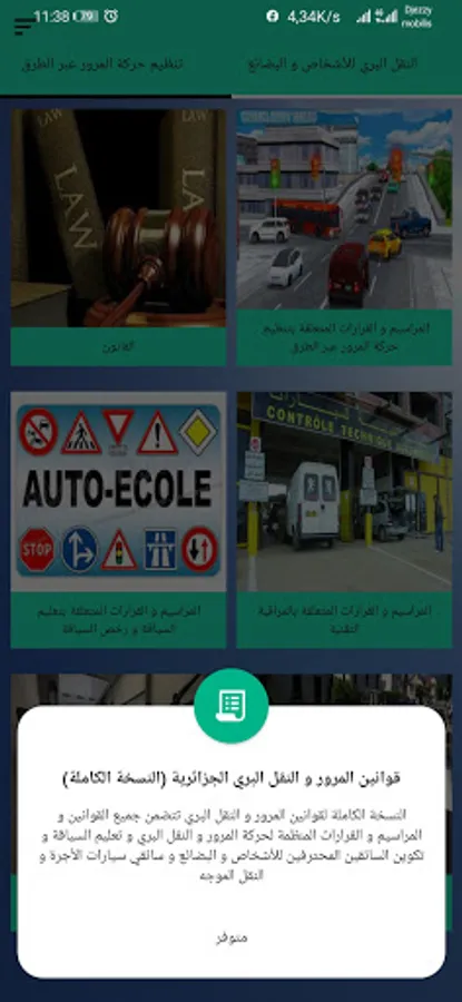 This application is concerned with spreading the traffic culture by displaying all the details of traffic laws through the roads and the land transport of people and goods from laws, implementing decrees and ministerial decisions with the aim of achieving safe driving without accidents and it is important for all categories of drivers, whether beginners or professionals or private and public carriers of goods As well as for driving schools, for technical control centers for vehicles, for lawmen from road security companies to the National Gendarmerie and the police, for judges and lawyers, as it is a unique application of its kind that contains everything related to the regulation of traffic and land transport of people and goods.