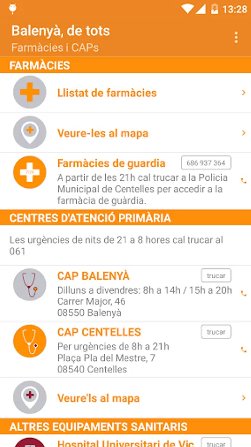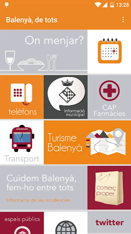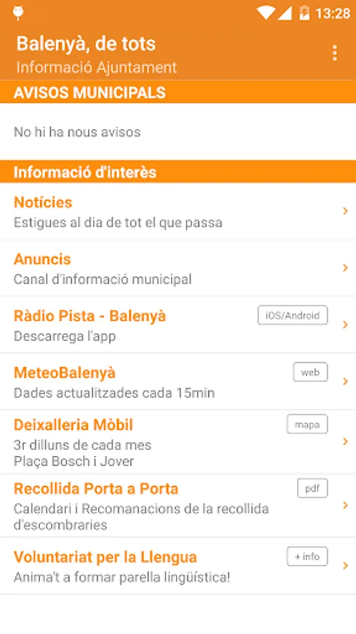 Information about the schedule of events, places to eat and bars, as well as all the shops and services to the public, and phonebook information about public spaces and public transport information. It also includes information on nature tourism the most important elements of the municipality, information on tours, audio guides of these points of interest, and other information. It also includes a section for complaints to highlight any incident within our municipality, under the title of "Caring Balenyà, let's do it together."