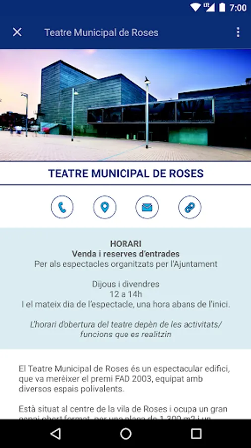 Roses app offers you all the local information of interest in your pocket. Here you can find all the information on the schedule of activities, festival, concrete events, announcements, associations of Roses, telephone numbers i emergency, local commerce, gastronomy, theater. News, health, sports, environment, network of parks and urban transport among others.