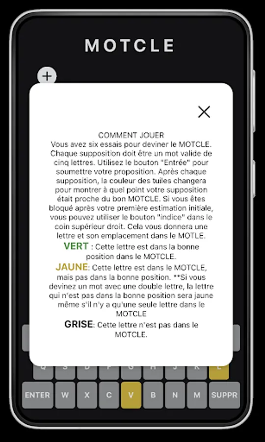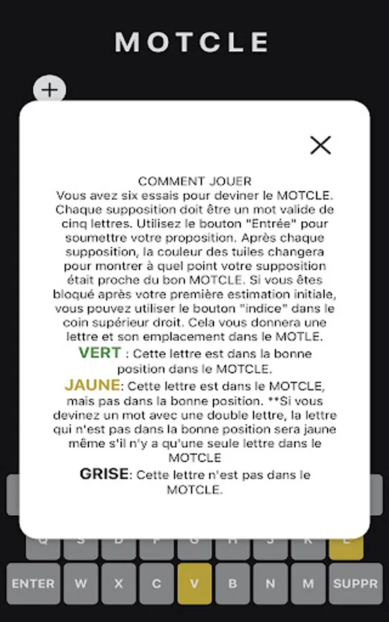 JAUNE : Cette lettre est dans le MOTCLE, mais pas dans la bonne position. ** Si vous devinez