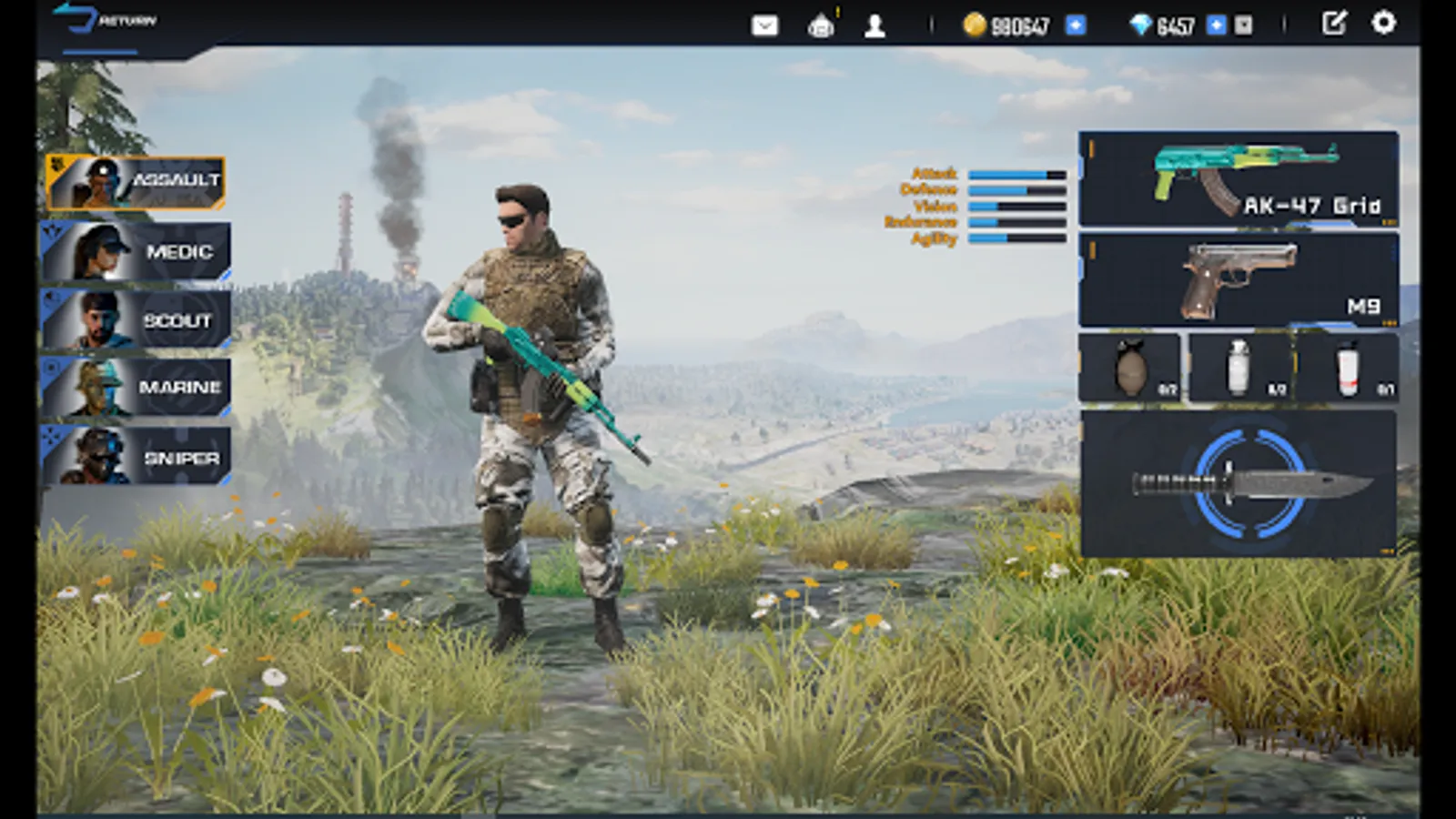 5 soldier classes, Assult, Scout, Medic, Rifleman, Sniper.