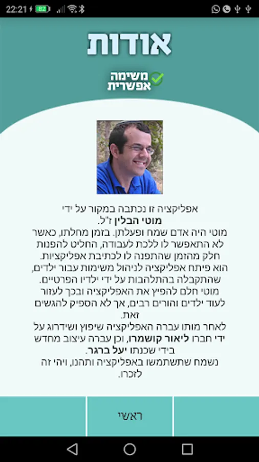 Moti was a happy and active. During his illness, when he was unable to go to work, he decided to turn some of the time freed him to write applications. He developed a task management app for children, was enthusiastically received by children in private.