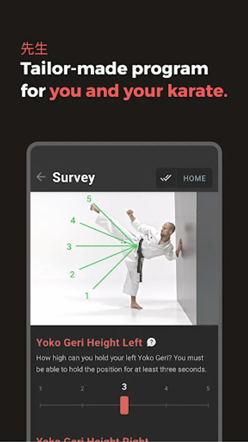 Sensei is the most advanced karate algorithm in the world. It tests your anatomy, strength and flexibility, asks about physical complaints and gets your body fit so that you can show your best karate. It regularly adapts your programme to your physical development. No matter if you want to regain old strength or if you are just starting your karate journey.