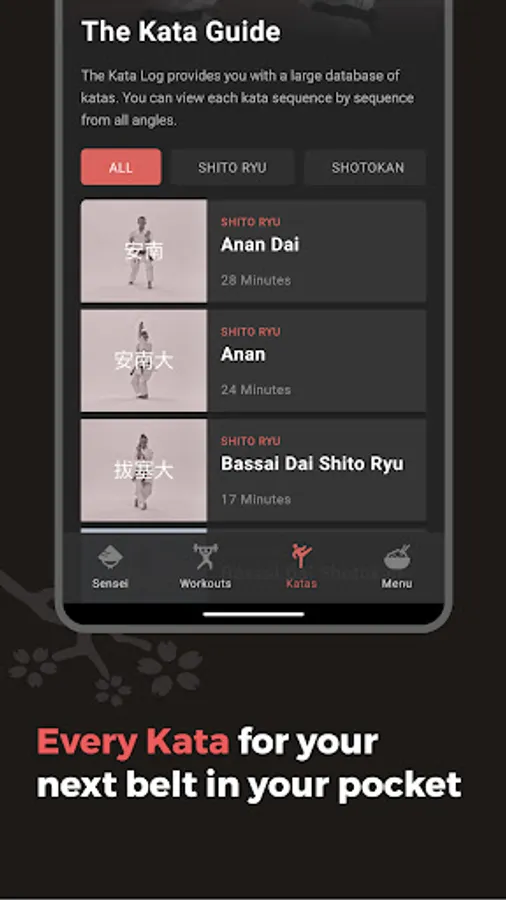 The Kata Log provides you with the largest database of kata. You can view each kata sequence by sequence from all angles. Whether Shito Ryu, Shotokan or Goju Ryu – the Dojo App provides you with the kata you want to learn now.