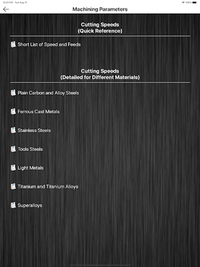 - Interactive machining parameter charts for cutting speed and feed rates for different materials