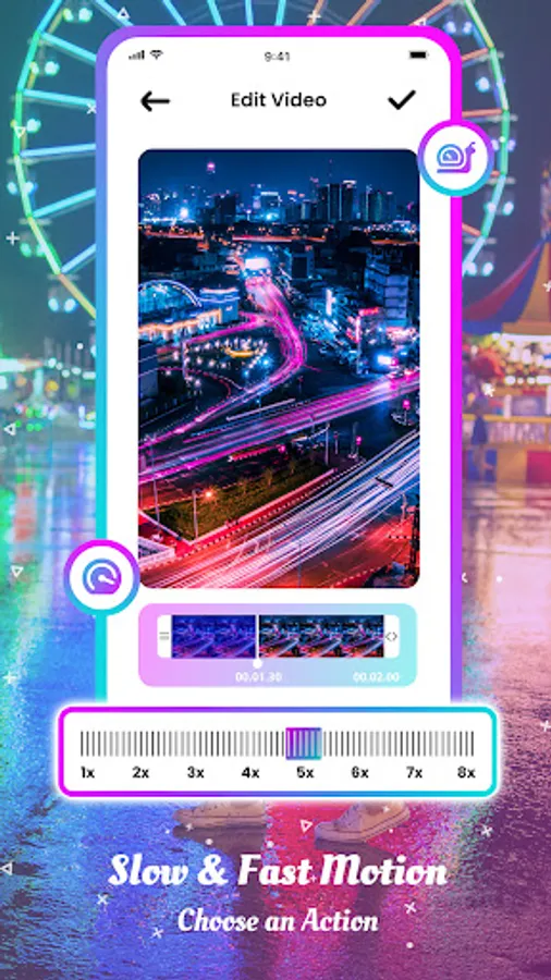 Fast & Slow motion video maker is an free app, Allows everyone to change their video motion at 5x faster or slower. App also allows to add music and effects to make your video more attactive.