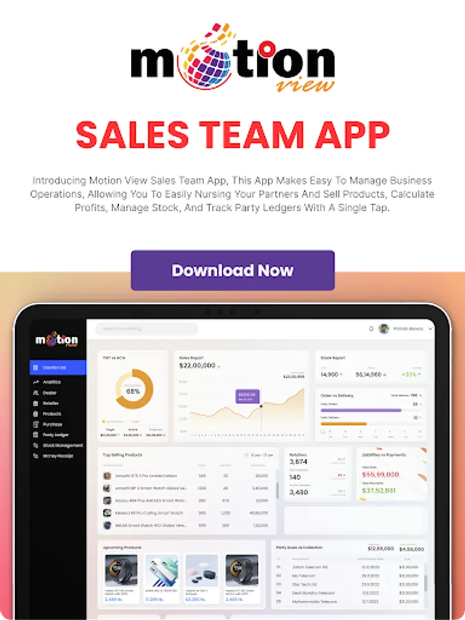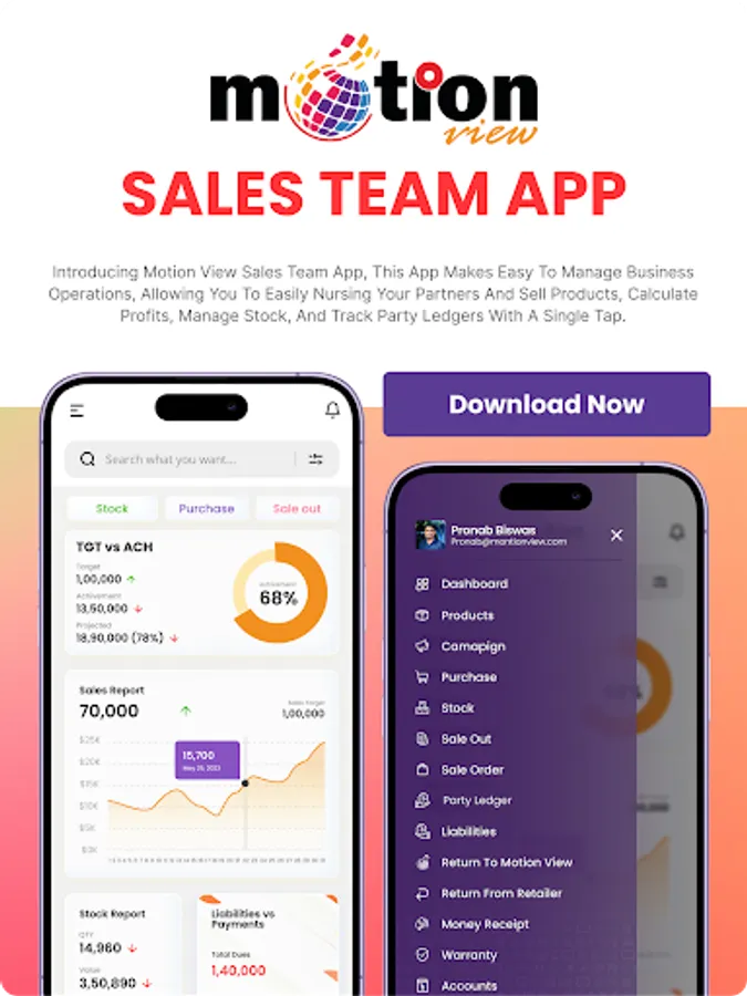 To improve the efficiency of your business operations, it is imperative to download the Motion View Sales Team app. With this app, you can easily build partnerships, sell products, keep track of inventory, and manage client ledgers. It's a convenient and efficient tool for any business owner.
