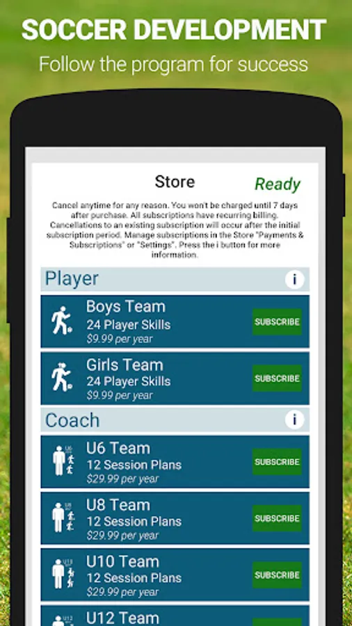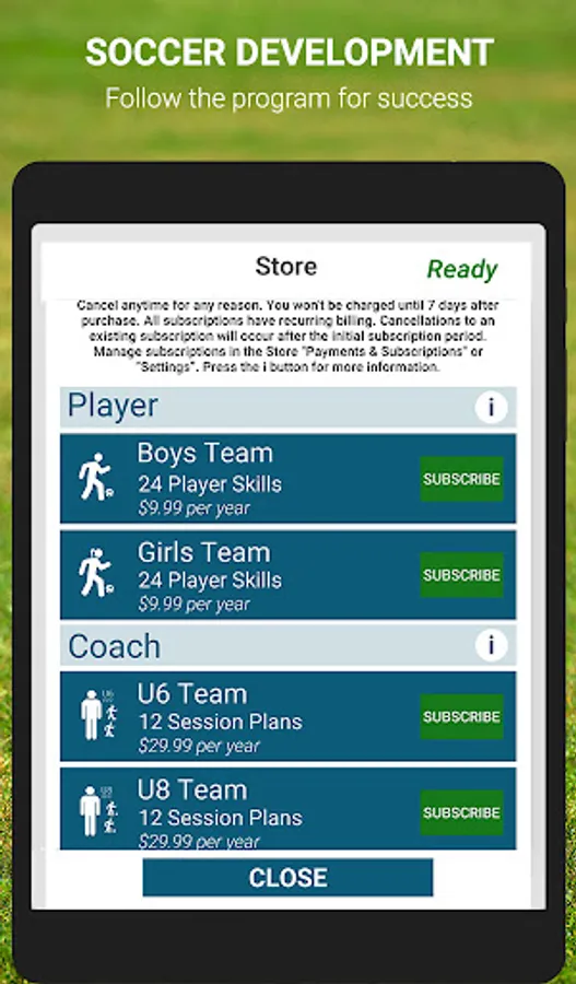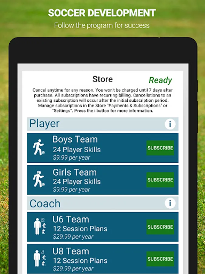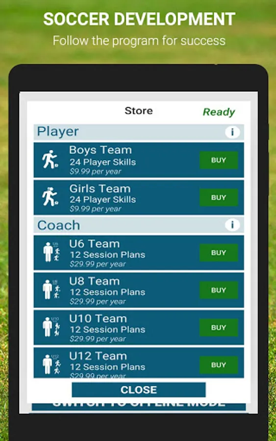 Use the BUY button in the app to find MOTI Soccer annual subscriptions for player skills, teacher lesson plans, and coaches team training for U6, U8, U10, U12, or U14 youth age groups.