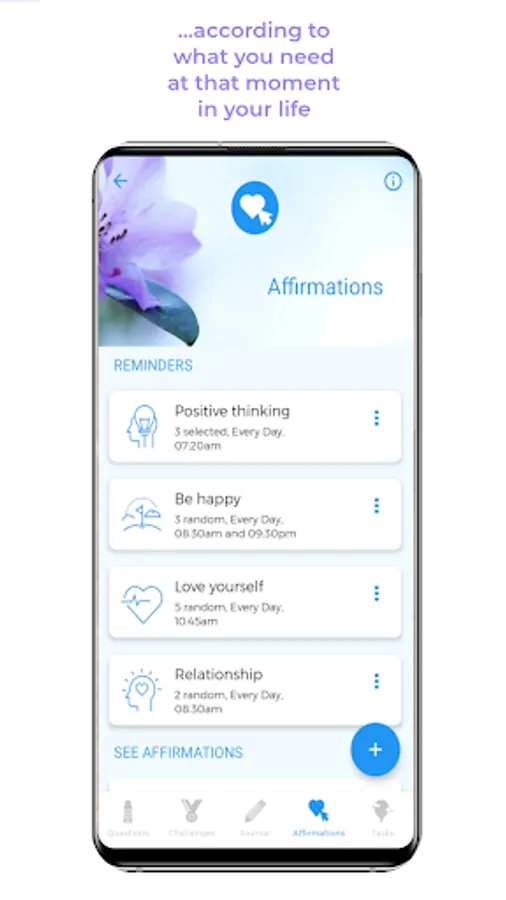 You can set affirmation reminders for a good time of day to repeat the affirmations to yourself, and you can choose what kind of affirmations you want to repeat. You can set reminders for many areas of your life and select different categories like Positive thinking, Be happy, Love yourself, Inner peace, Relationship, Health etc.