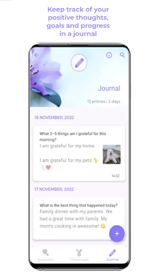 Positive Thoughts & Happiness helps you focus on positive thinking, gratitude, happiness, loving yourself more and knowing yourself better. Increase your happiness by positive self-questions, daily reminders, positive challenges and a positivity journal. Loving and knowing yourself and positive thinking are the basis of a meaningful and happy life.