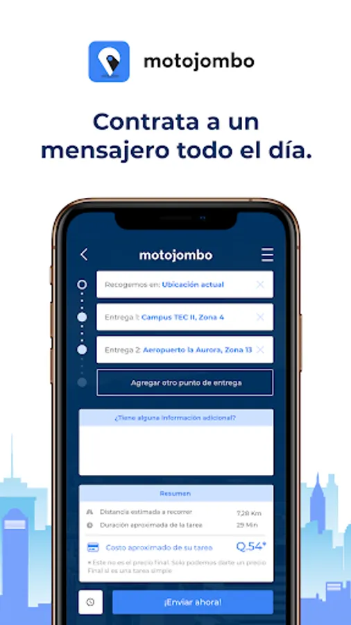 Motojombo is a mobile and web messaging service application. We can help you with shipments, errands and administrative procedures.