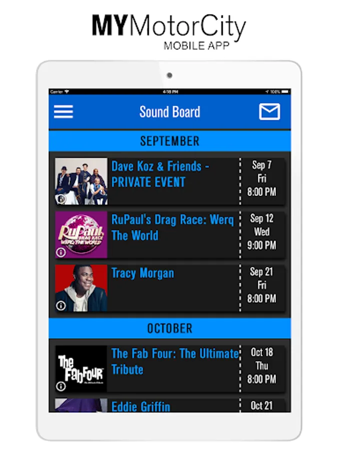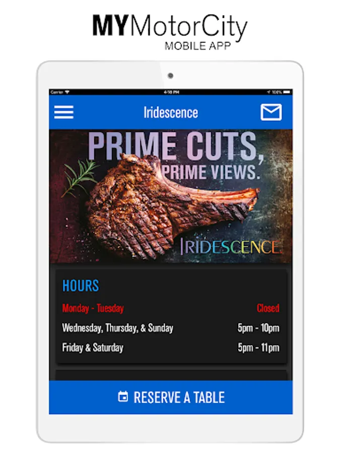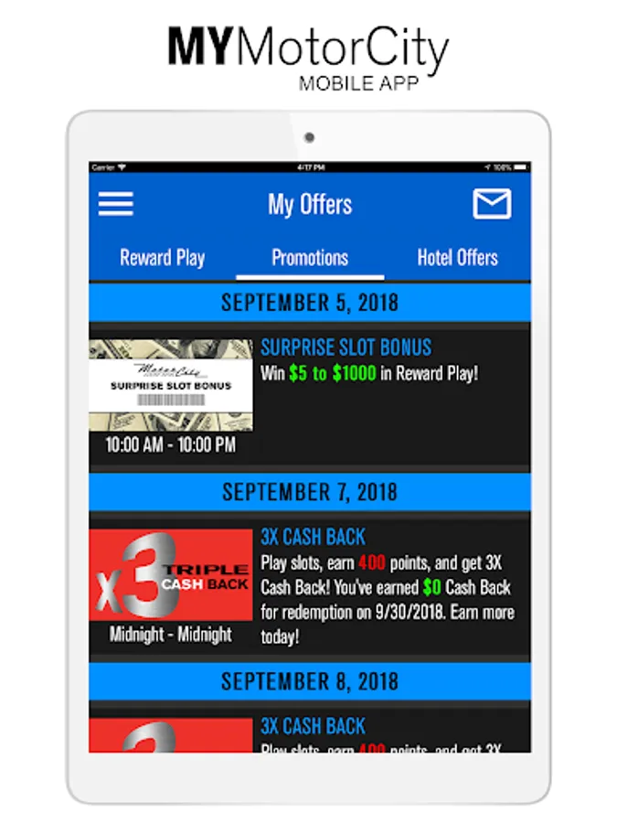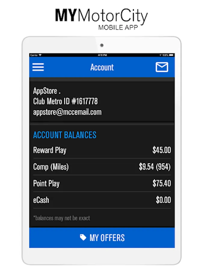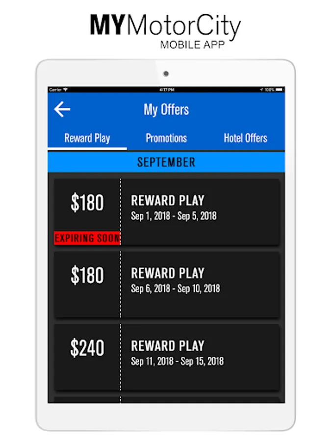 Use the MYMotorCity app to quickly and easily view your casino and hotel offers and account balances, convert comp to Reward Play®, make reservations at Iridescence, buy Sound Board tickets and check upcoming show schedules, book hotel rooms, see the current Bad Beat jackpots, and so much more.