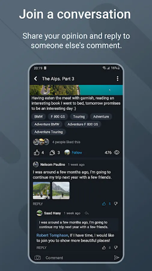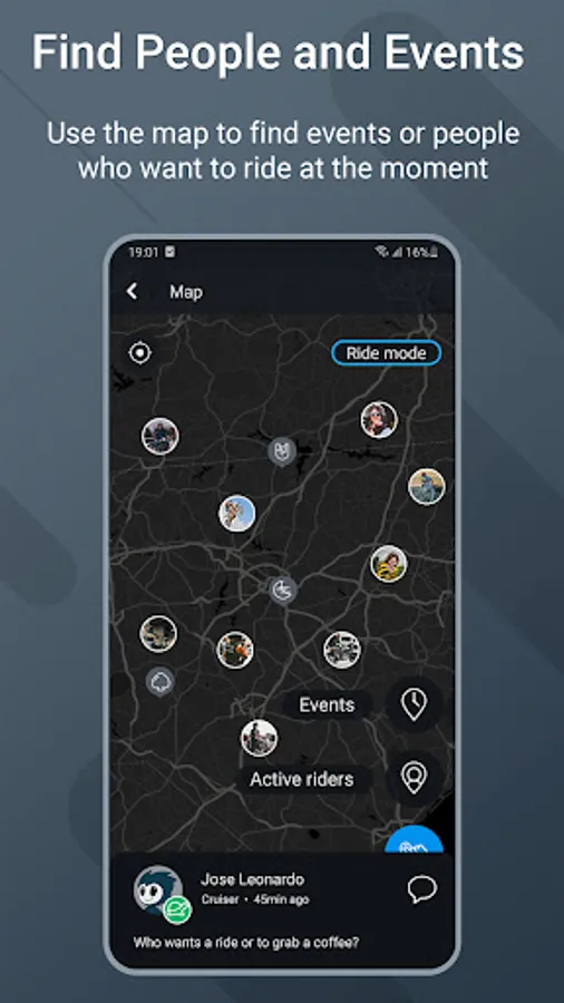 - Follow interesting users or motorcycles and read about their social activity in your feed