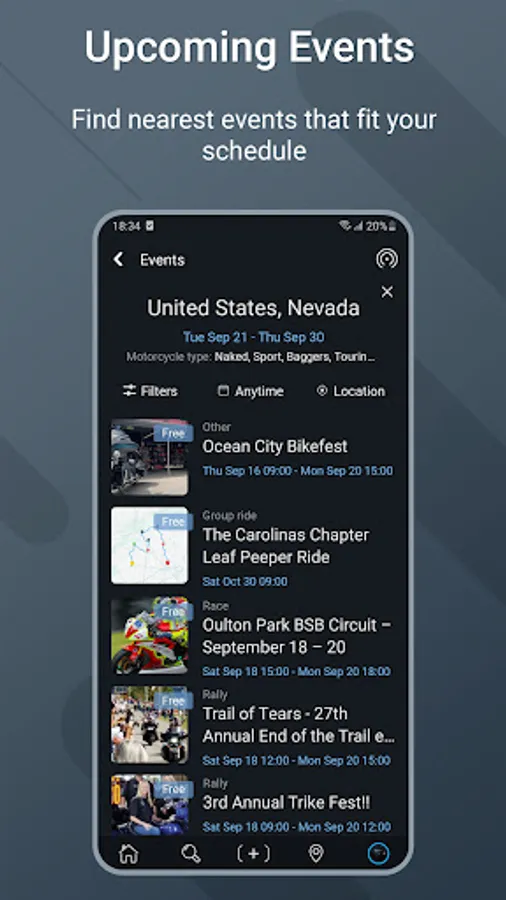 - Find events like bike night, charity, poker day from your chosen location at any time convenient for you