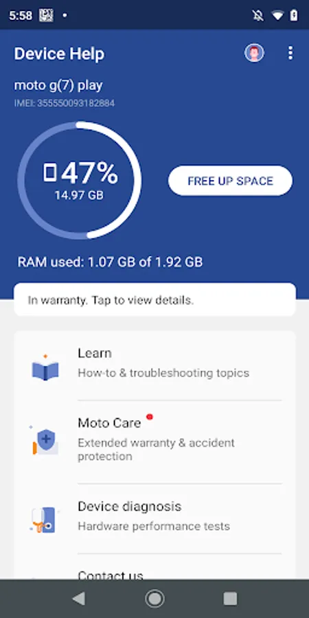 Device Help provides you a whole product life cycle service experience, including Learn, Moto Care, Device diagnosis, Repair service and Contact us.