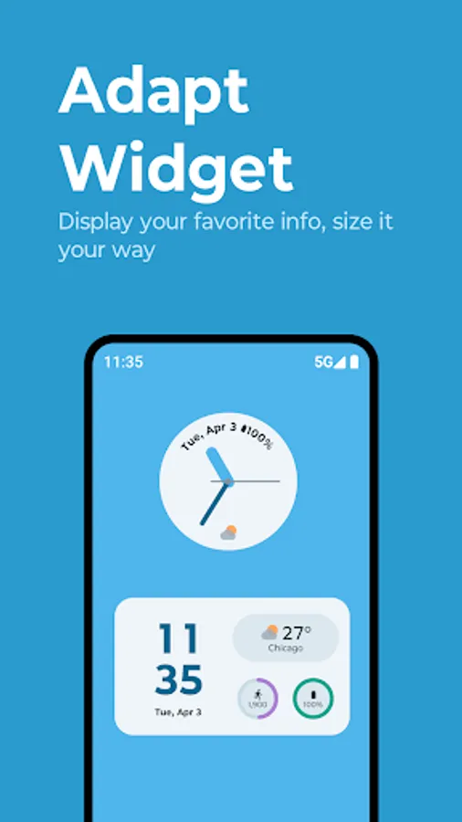 Adapt and Weather widgets can be personalized. Change the size of Adapt widget and Weather widget by long pressing on the widget and dragging the handle. The widget will expand and contract to fit the new size. You can change the widget's opacity, clock style, and more by long pressing on the widget and tapping the edit icon. If your OS is Android 11, tap widget settings on the top right of the display.
