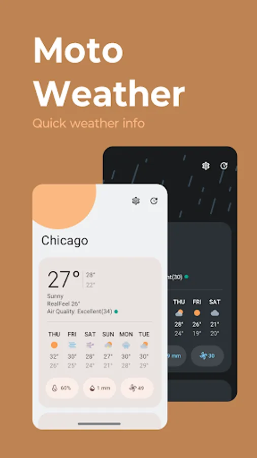 In addition to the new Adapt and Weather widgets, you can choose from classic widgets including Beyond widget, Classic battery ring widget, or Clean rectangle widget. These widgets can be viewed in Moto's iconic circle style or in plain text. Tap the weather info on each widget to access a separate weather page with a detailed weather forecast.