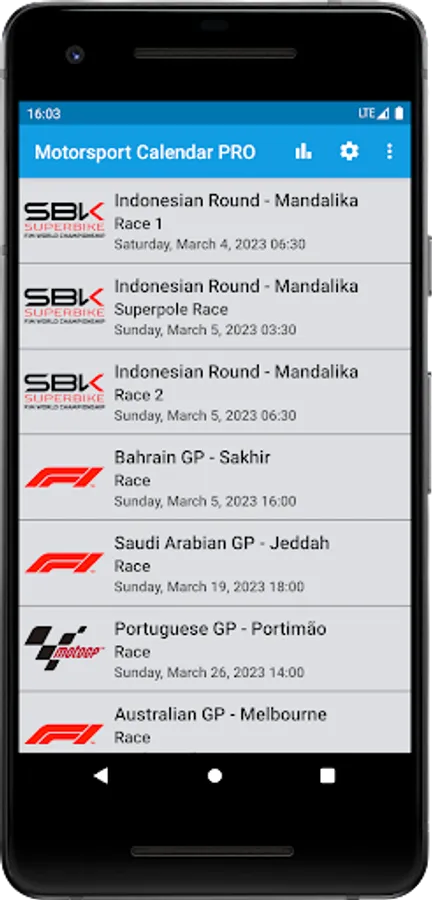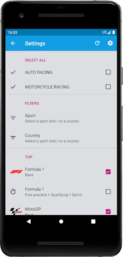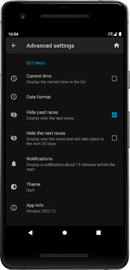 - activate the notifications that will remind us that a race is about to start, being able to choose whether to receive it 15, 30, 45 or 60 minutes before;