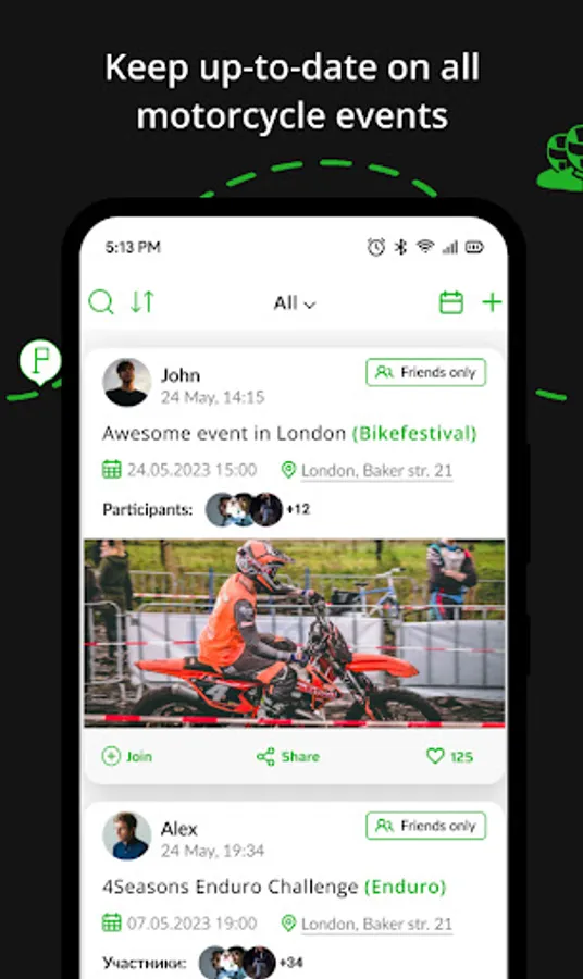 Events: Keep up to date with all the motorcycle events nearby or create your own and invite people to attend.