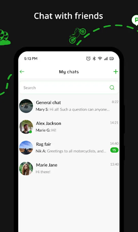 Groups + Chats: You can discover new friends or connect with your existing riding buddies and initiate a conversation using our chat feature within the app.