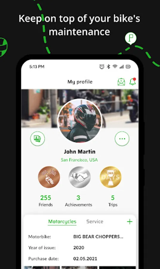 Garage: Keep all the necessary information about your bike and its maintenance and receive service notifications right in the app.