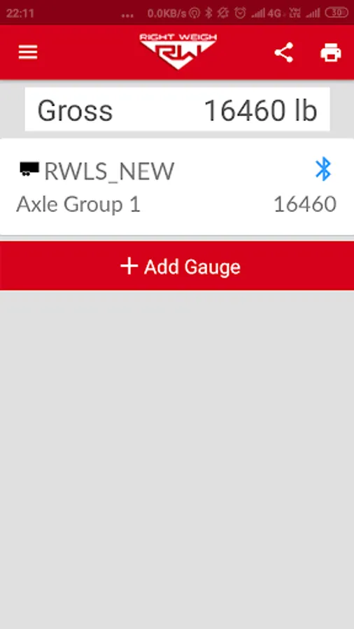 Monitor axle group weights, share current weight via email or text message, and print a weight ticket over most commercially available POS-style Bluetooth printers. Other features include scale name customization, net weight with tare button, overweight warning, and air suspension pressure display.