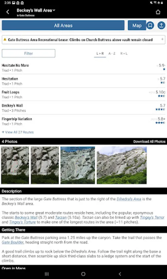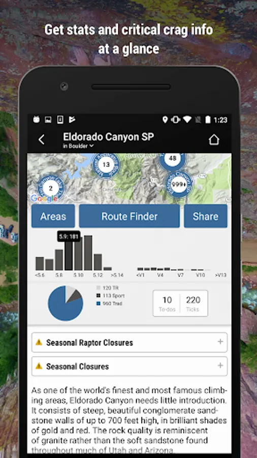 • View a climbing area’s route stats (how many 5.11s are there?) and critical info (when is the raptor closure again?) in a single glance.