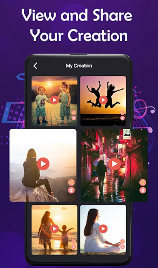 All you need to do to create great videos is: Choose photos. Add music. Set effects, time. Save videos, slideshows and share them with friends.