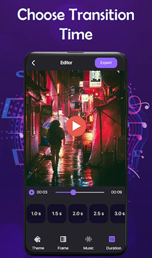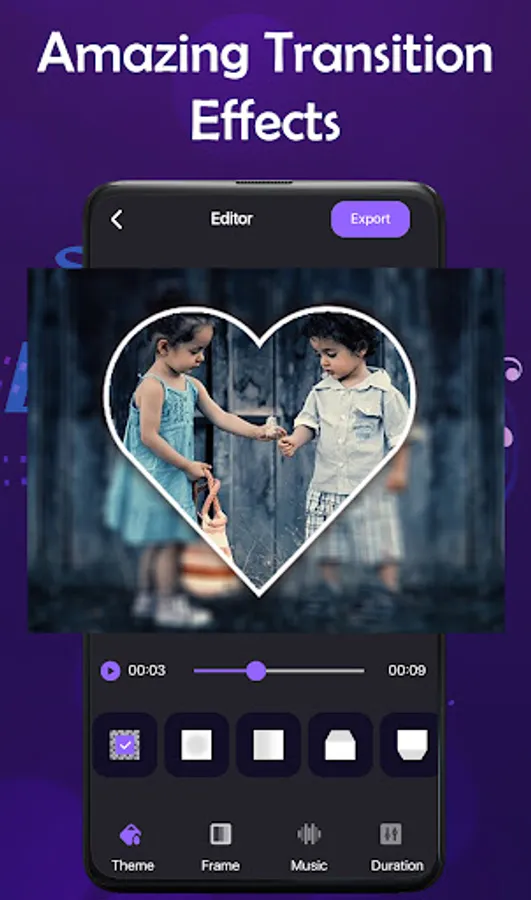 * Music: The app provides melodies that match every video theme. You can also add your favorite songs and music tracks from the device to make your videos interesting and engaging.