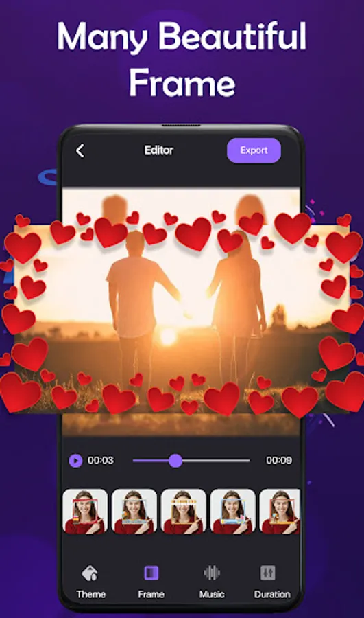 * Frame and time slideshow: Lots of beautiful and varied frames for your video to be unique. You can also edit the video speed quickly or slowly by selecting the duration of the slideshow.
