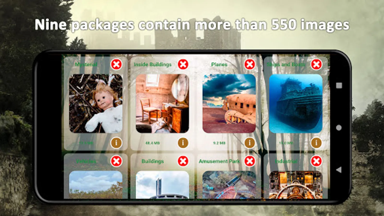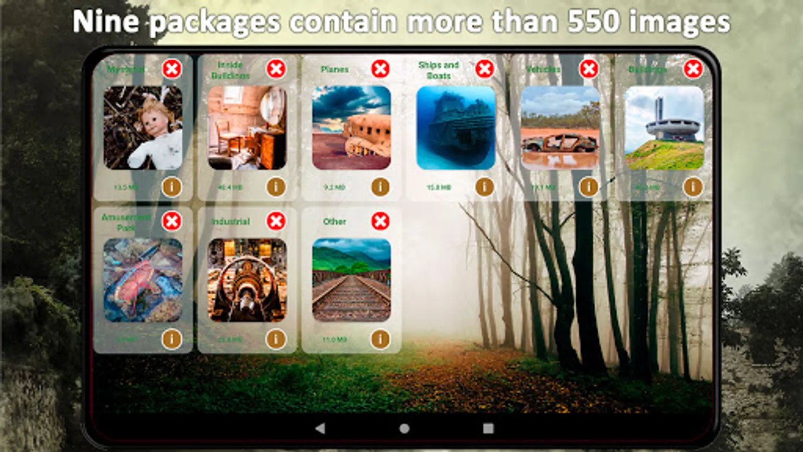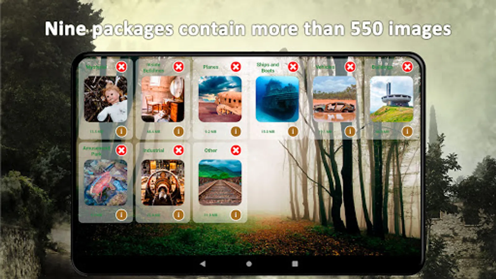You are invited to explore the most mysterious and abandoned places in the world, by collecting and building the image of each place in a very entertaining and challenging way using mobile touches to slide and switch image pieces to reach the complete shape of the abandoned place.