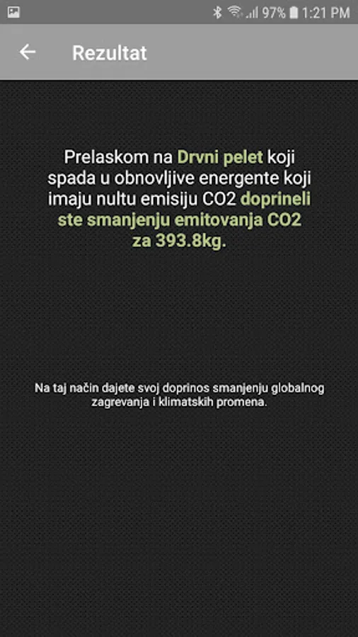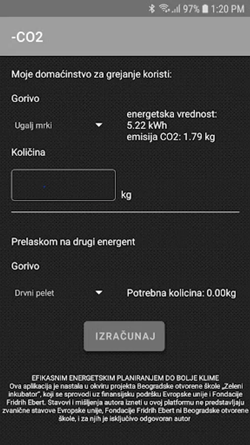 Ukoliko vaše domaćinstvo koristi, na primer, mrki ugalj za grejanje, uz pomoć ove aplikacije možete izračunati koliko manje CO2 ćete emitovati u atmosferu prelaskom na neki drugi energent.