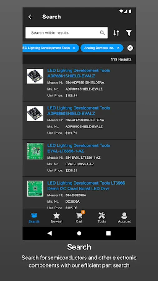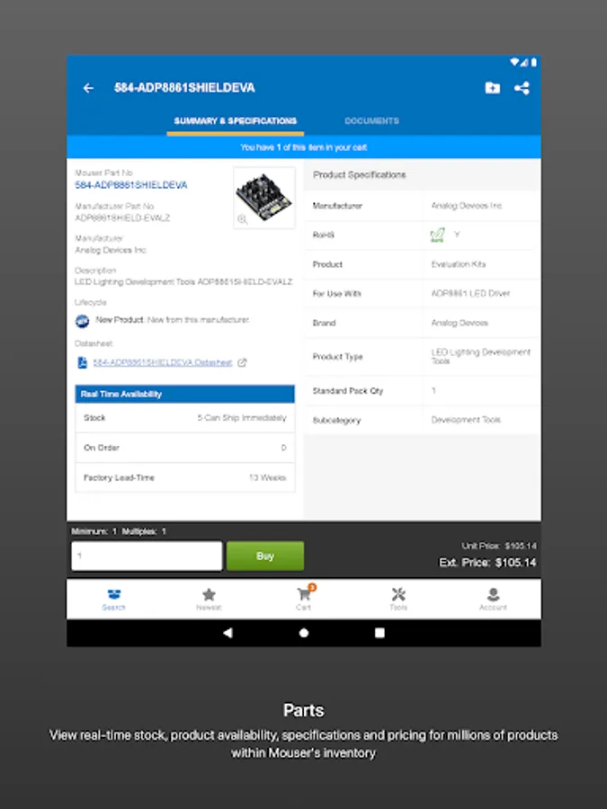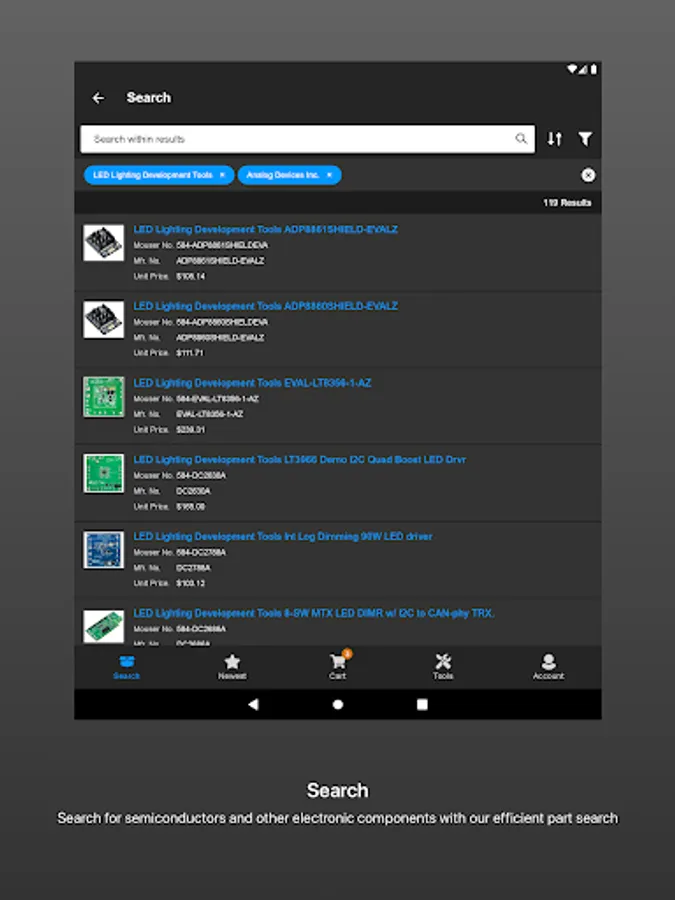 The Mouser app allows you to easily access the newest semiconductors and electronic components for your designs. Easily browse the newest products by date, category or manufacturer. Find products and view stock availability through a user-friendly search or built-in barcode scanner with the ability to build a shopping artc or project to checkout online.