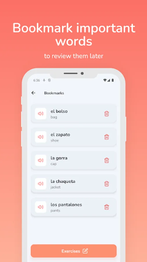 Mova supports English, German, Spanish, Italian, French, Portuguese, Ukrainian, Chinese, Czech or Polish. It contains more than 3000 of the most common words sorted by difficulty. Each level has interactive exercises to help you memorize new words. If you don't like certain exercises, you can turn them off in the settings. If you have trouble with some words, you can add them to your bookmarks.