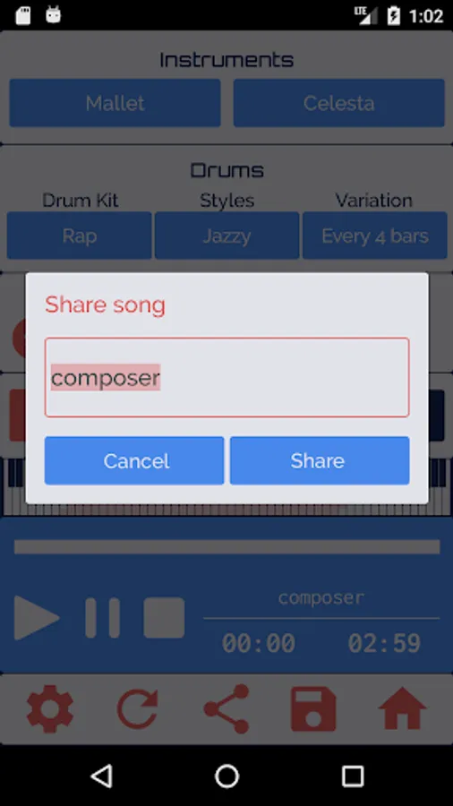 Composer lite creates and composes original music and songs with melodies and drum beats, through random algorithms, up to 2 minutes and 59 seconds length (60 minutes in paid version). Without the need of any musical skill .