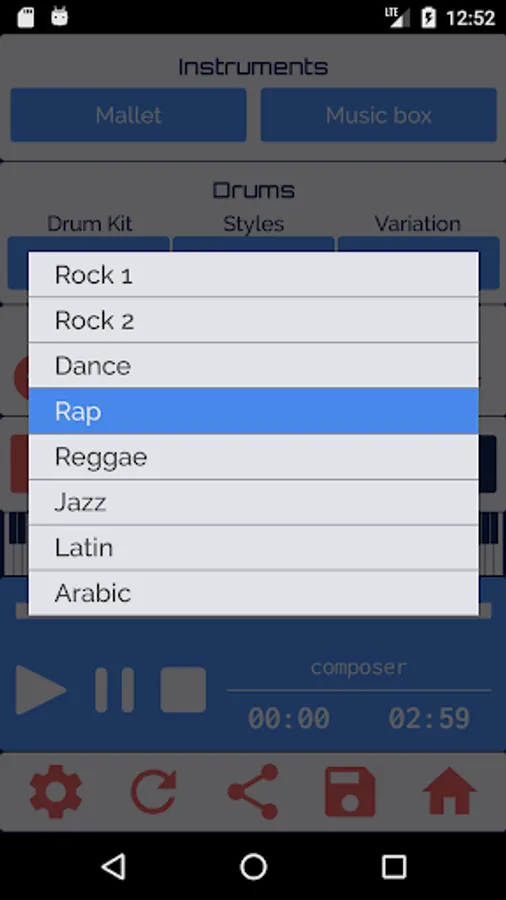 Composer lite's beatbox, with more than 30 percussion instruments, offers you 64 drum beats with 64 variations, sorted by type of rhythm and style.