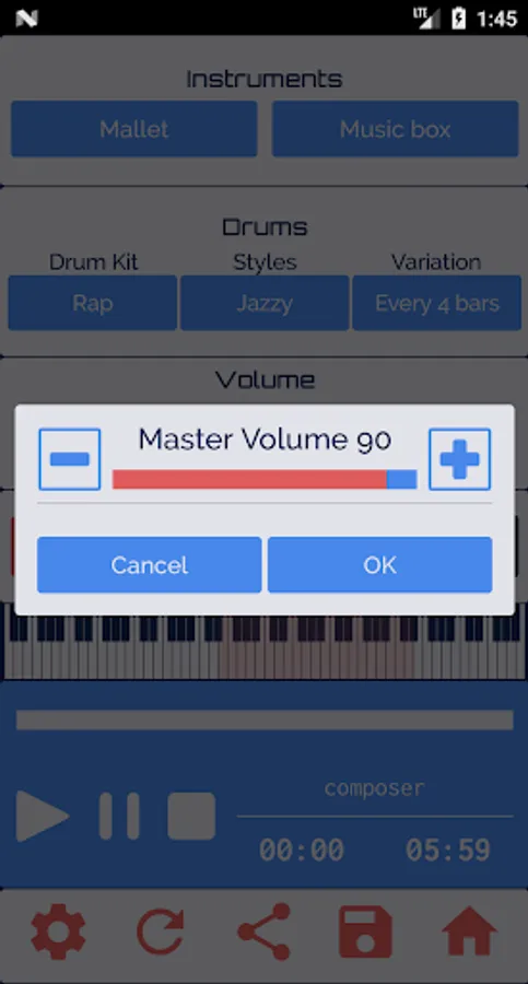 Composer lite offers you 128 high quality instruments, 24 melodic styles and a range of user configurations or presets, so you can start composing your music immediately.