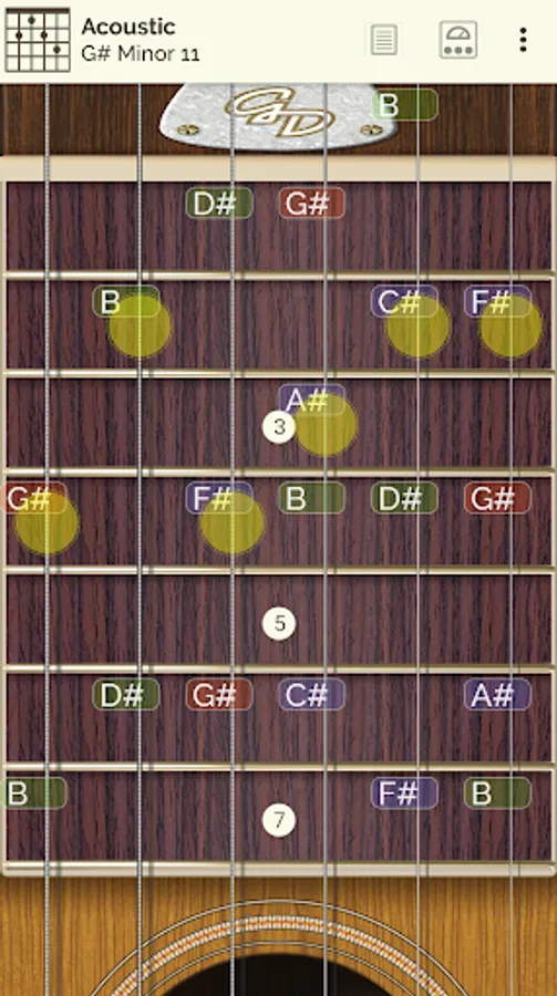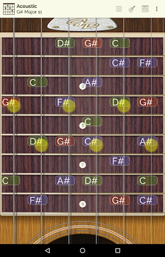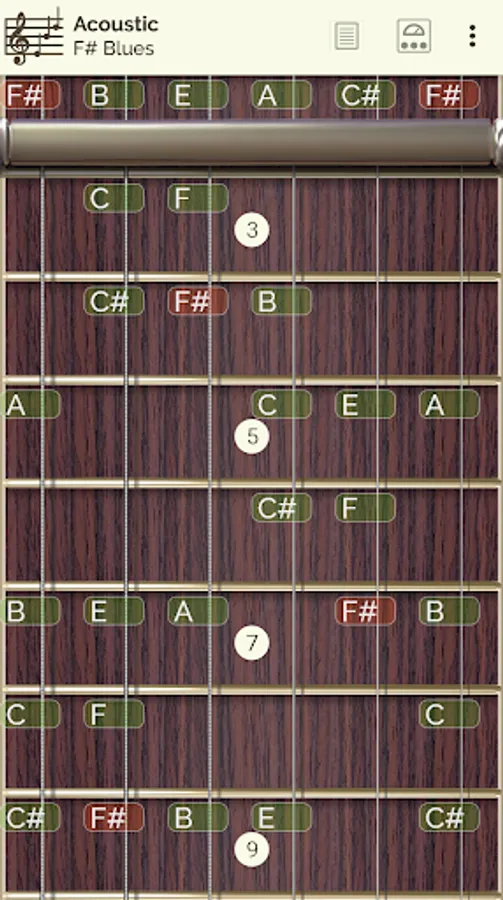 You can see and listen to 24 scale types * and 18 chord types * all along the fingerboard as well as the note info pulsed, on screen