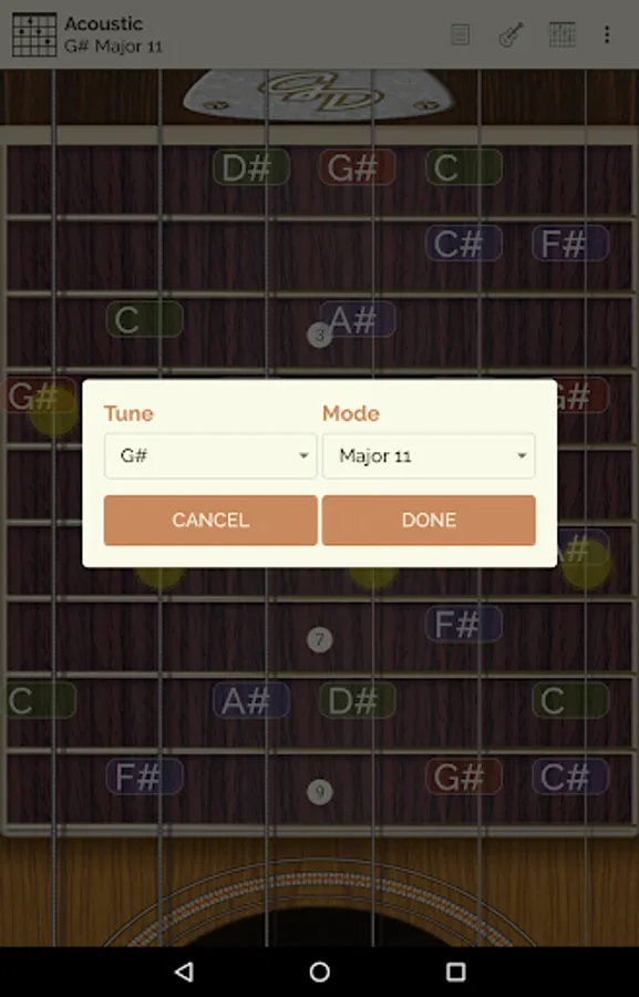 Guitar Droid lite is a multitouch configurable guitar with 24 scale types, 18 chord types, configurable tunings, sound effects and audio engine with up to 16 simultaneous voices .