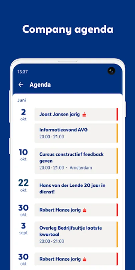 The agenda contains birthdays, anniversaries, company meetings and events.