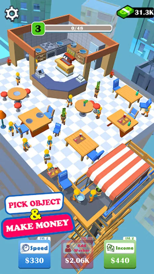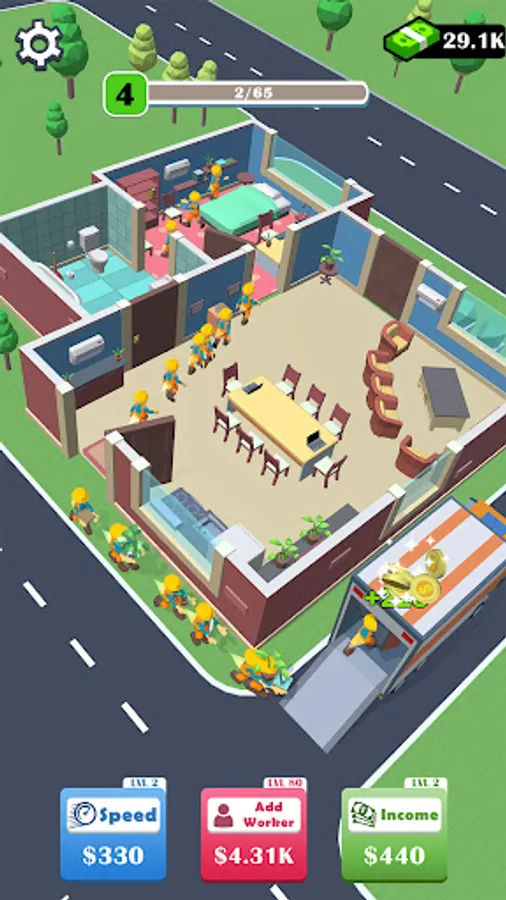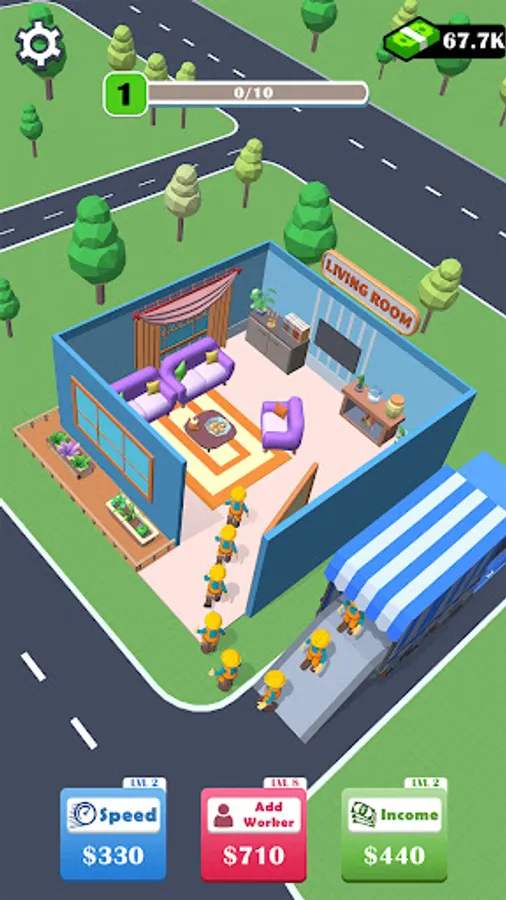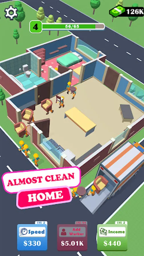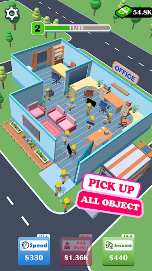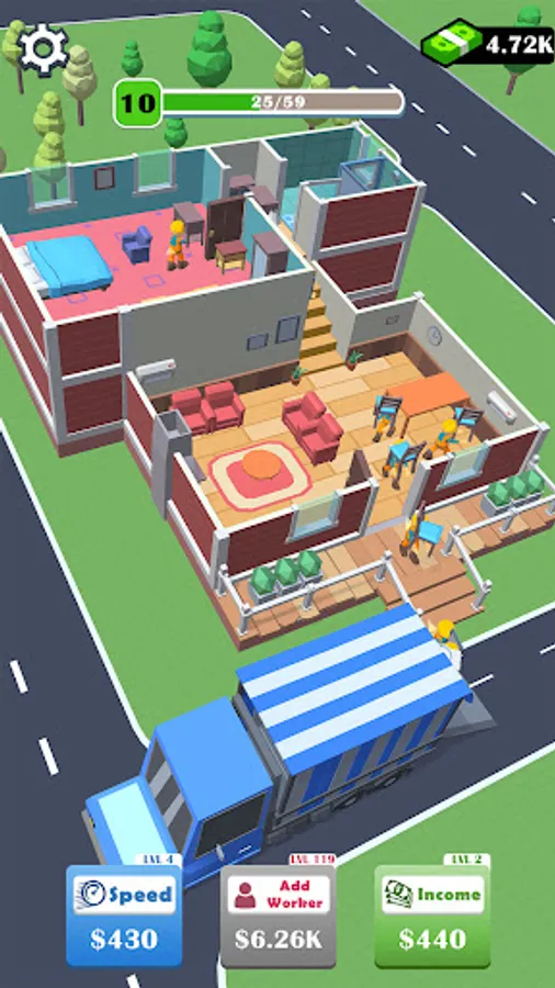 Work hard, from small house object to skyscraper all you need to move to earn more money. Add workers in your team and become biggest movers in the town. Unlock new bigger building every time, earn more money and from that you can add more workers and buy trucks to expand your business.