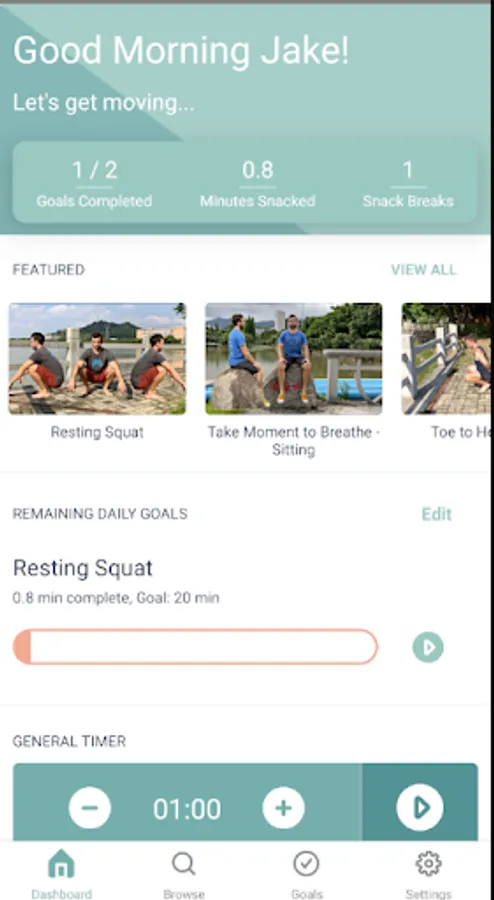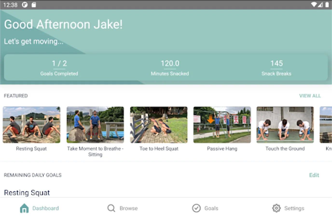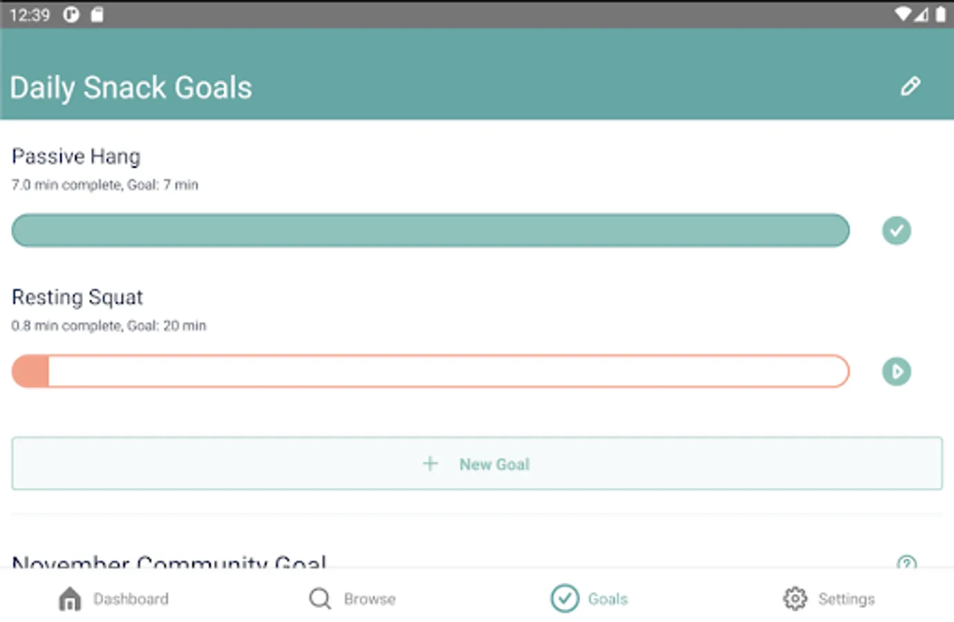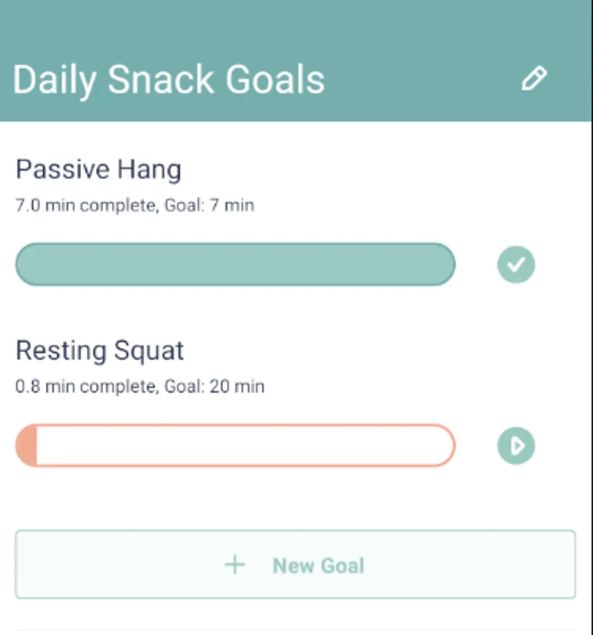 To develop a craving for movement users should utilize daily snack goals. Each goal will have a daily total and are tracked with a timer. The time is meant to be cumulative during the day, and not completed all at once. Aim to spend 30 seconds to a few minutes per snack per session. There are two default goals: the resting squat and the passive hang. Earn a sense of accomplishment by pushing the progress bar on the goals tab to completion!